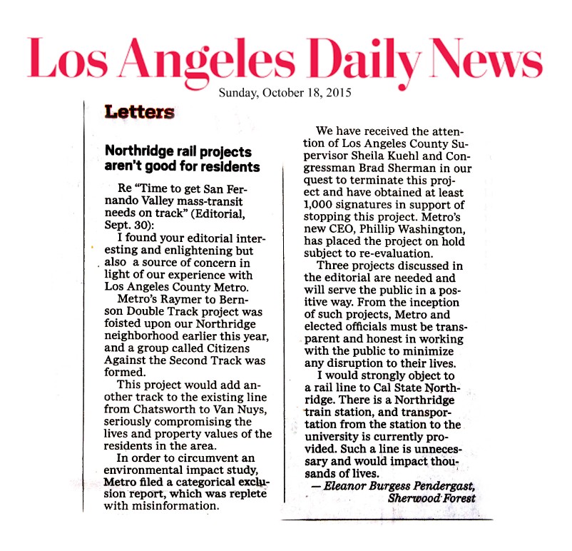 Published Opinion - No Double Track, Citizens Against Double Track, Northridge Citizens For Environmental Justice