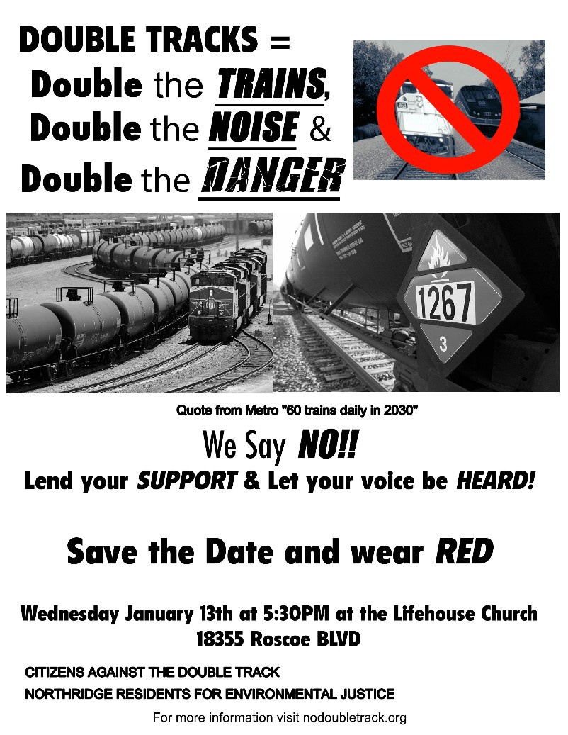 Check this page for upcoming events where your participation can help prevent the disastrous and ill-conceived Double Track Project from ever seeing the light of day. Save our community from becoming a noisy, disruptive and polluted zone of endless rail traffic and exascerbated automobile congestion.